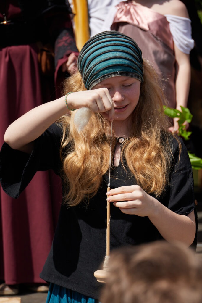 In der historischen Spinnstube in der Orangerie können Kinder und Erwachsene alte textile Techniken auch selbst ausprobieren. Es gibt kleine Workshops im Spinnen oder Nadelbinden, und den ganzen Tag über könnt ihr zum mittelalterlichen Schlaufenflechten vorbeikommen!